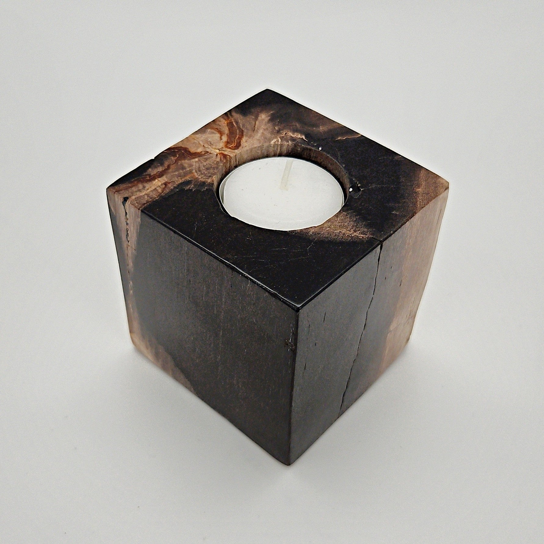 Overfladen er håndpoleret, hvilket fremhæver dybden i farverne og skaber en glat, eksklusiv finish. Formen er skåret som en kubus — enkel, arkitektonisk og tidløs.