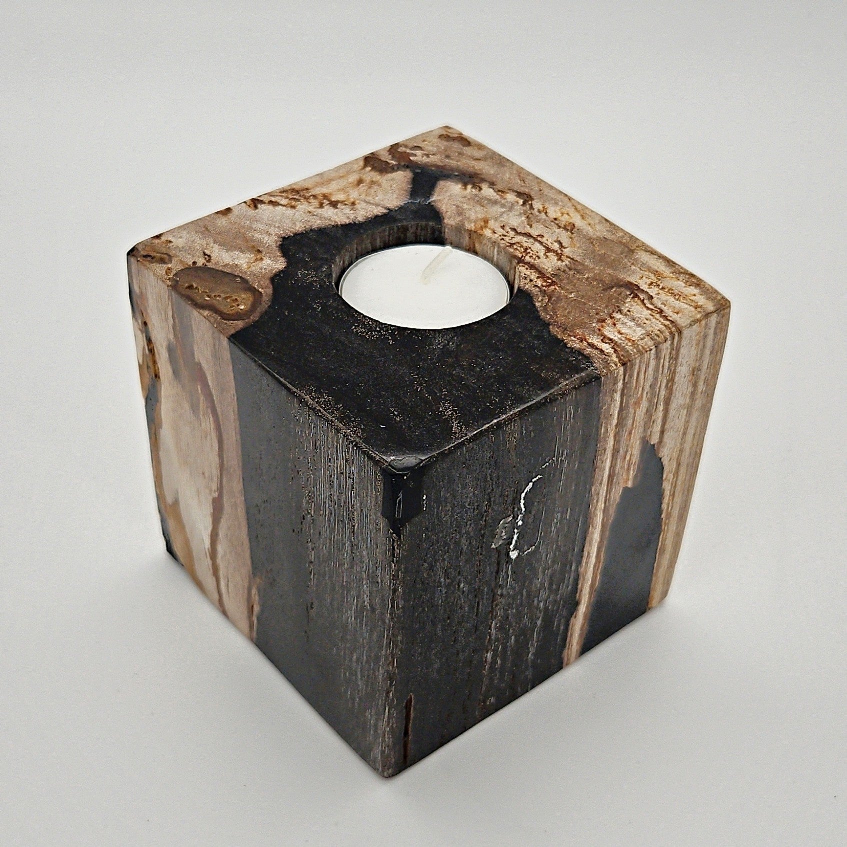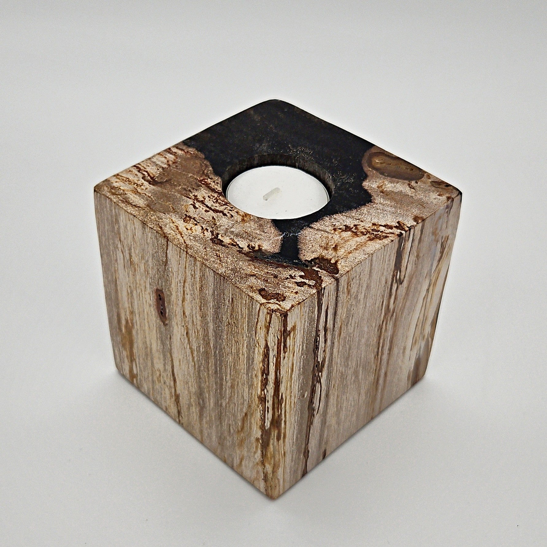 Denne fyrfadsstage er skabt af træ, der over millioner af år er blevet forstenet og forvandlet til sten. Den håndpolerede overflade fremhæver årerne og dybden i farverne, mens den skarpe kubiske form giver stagen et moderne og arkitektonisk udtryk. Lyset reflekteres blødt i den glatte finish og skaber en sanselig og eksklusiv stemning i rummet.