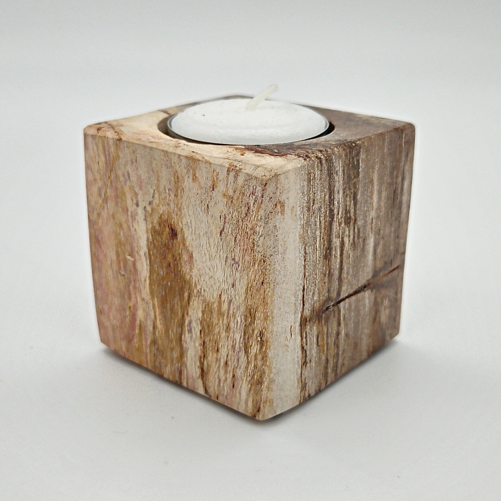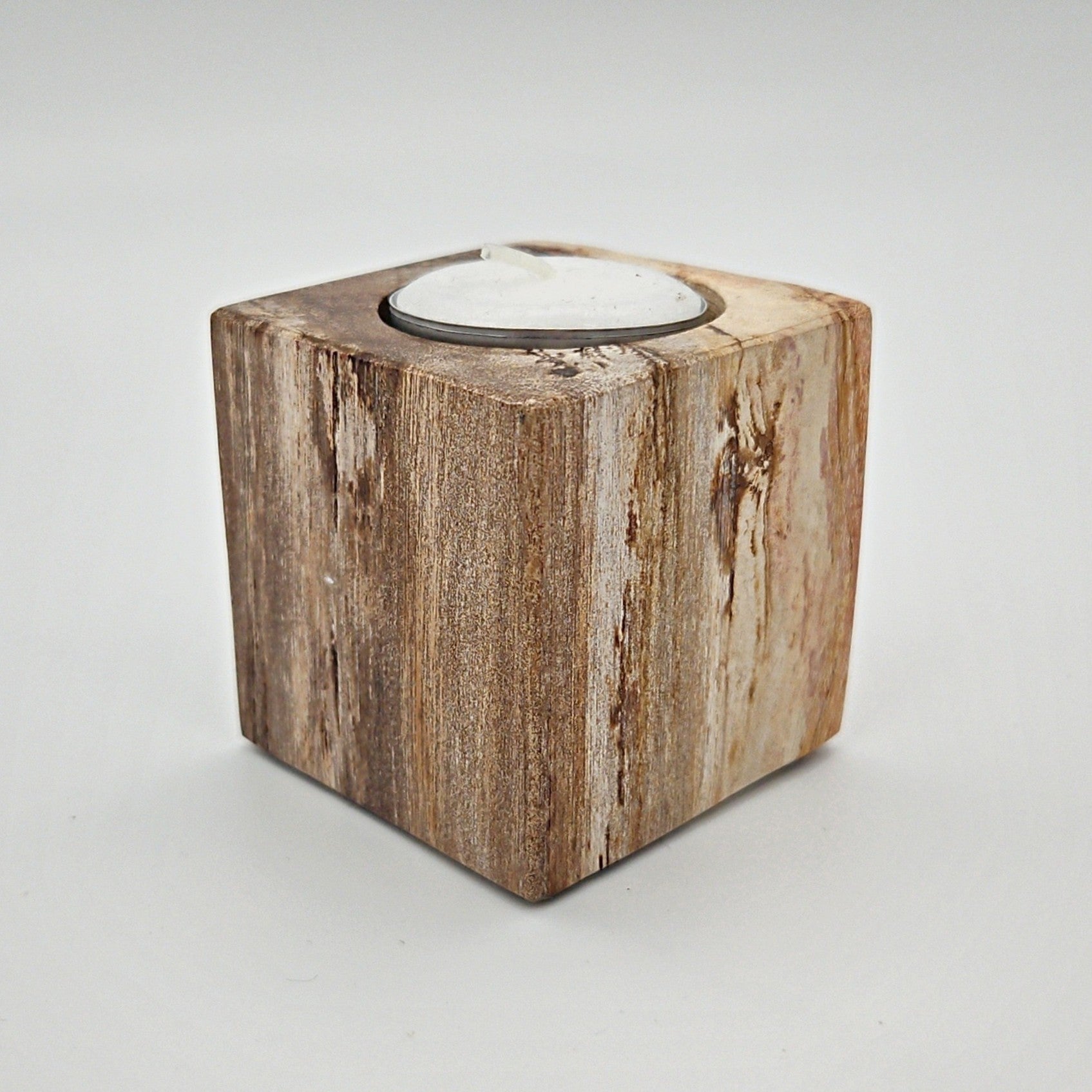 Den kubiske form tilfører et moderne og arkitektonisk udtryk, mens de varme, lyse nuancer skaber en harmonisk og rolig atmosfære. Når lyset tændes, opstår en blød kontrast mellem stagens rå ydre og fyrfadslysets varme glød.