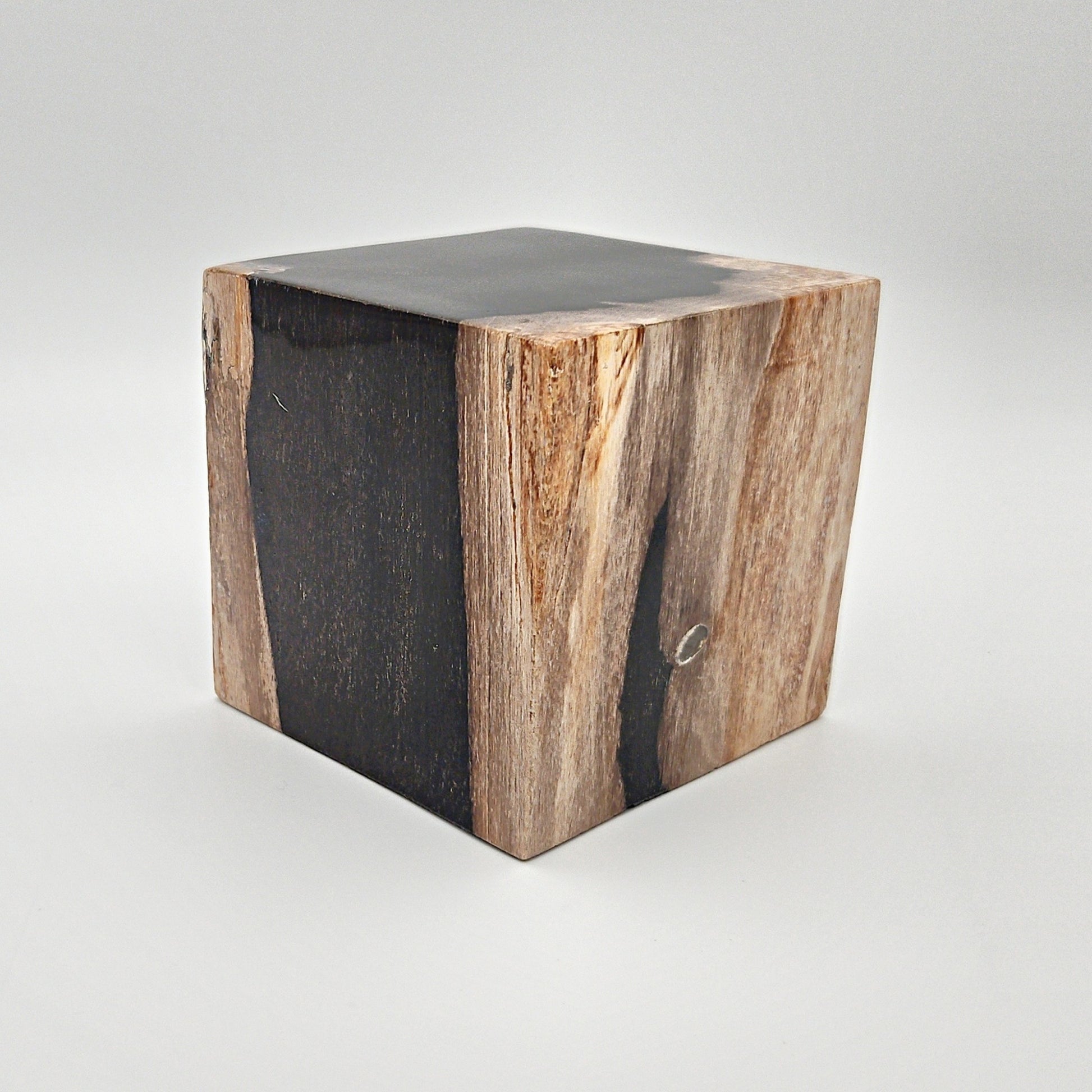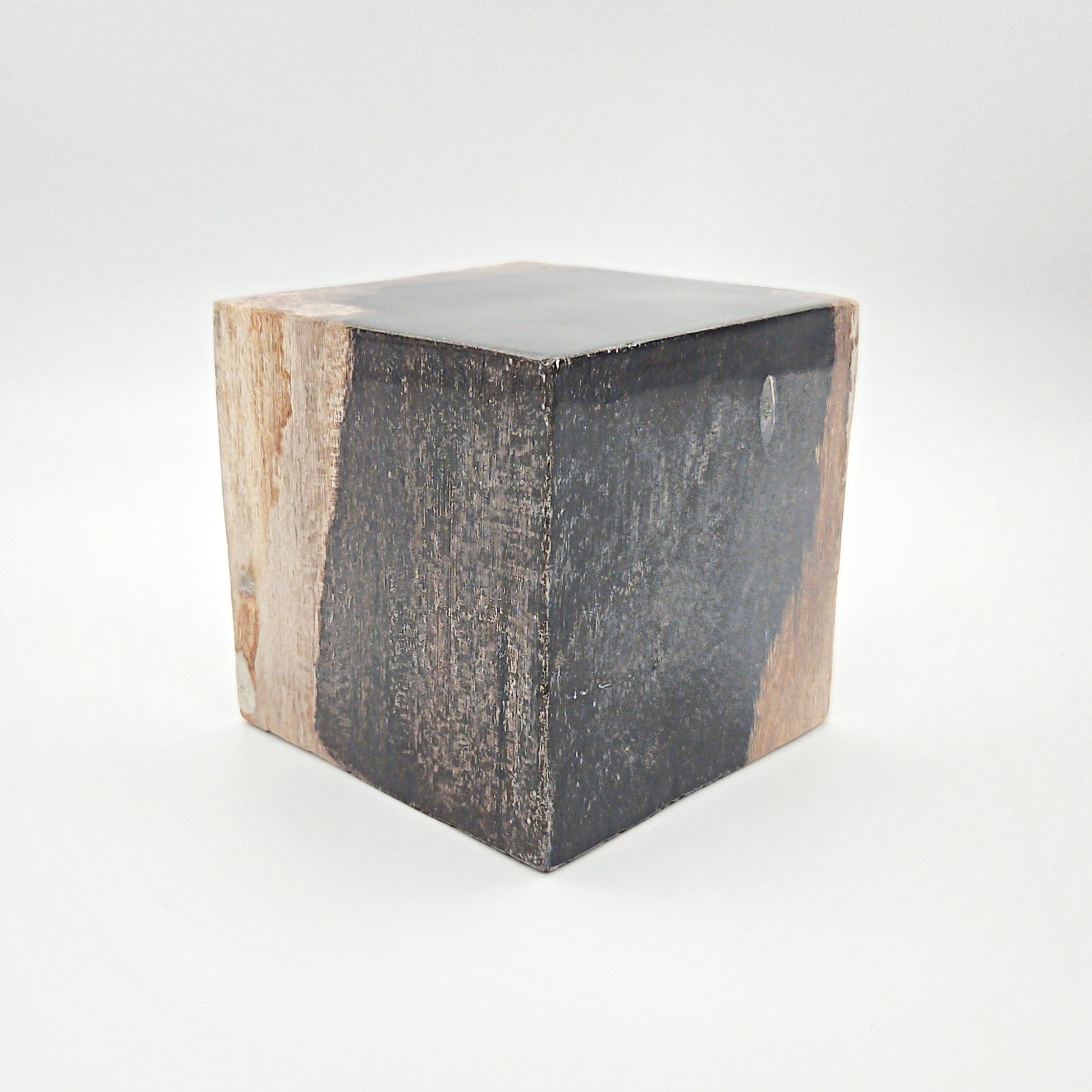 Terningen i forstenet træ er et skulpturelt objekt skabt af et naturfænomen, der har taget millioner af år. Det oprindelige træ er gradvist blevet forvandlet til sten gennem mineraler, tid og tryk – og hver terning bærer et unikt mønster af årer, farvespil og mineraler, som kun naturen kan skabe.
