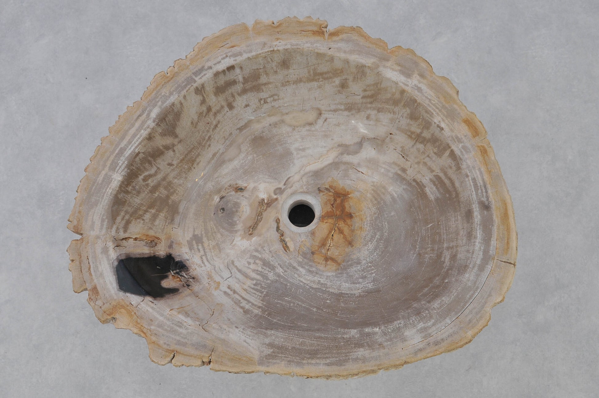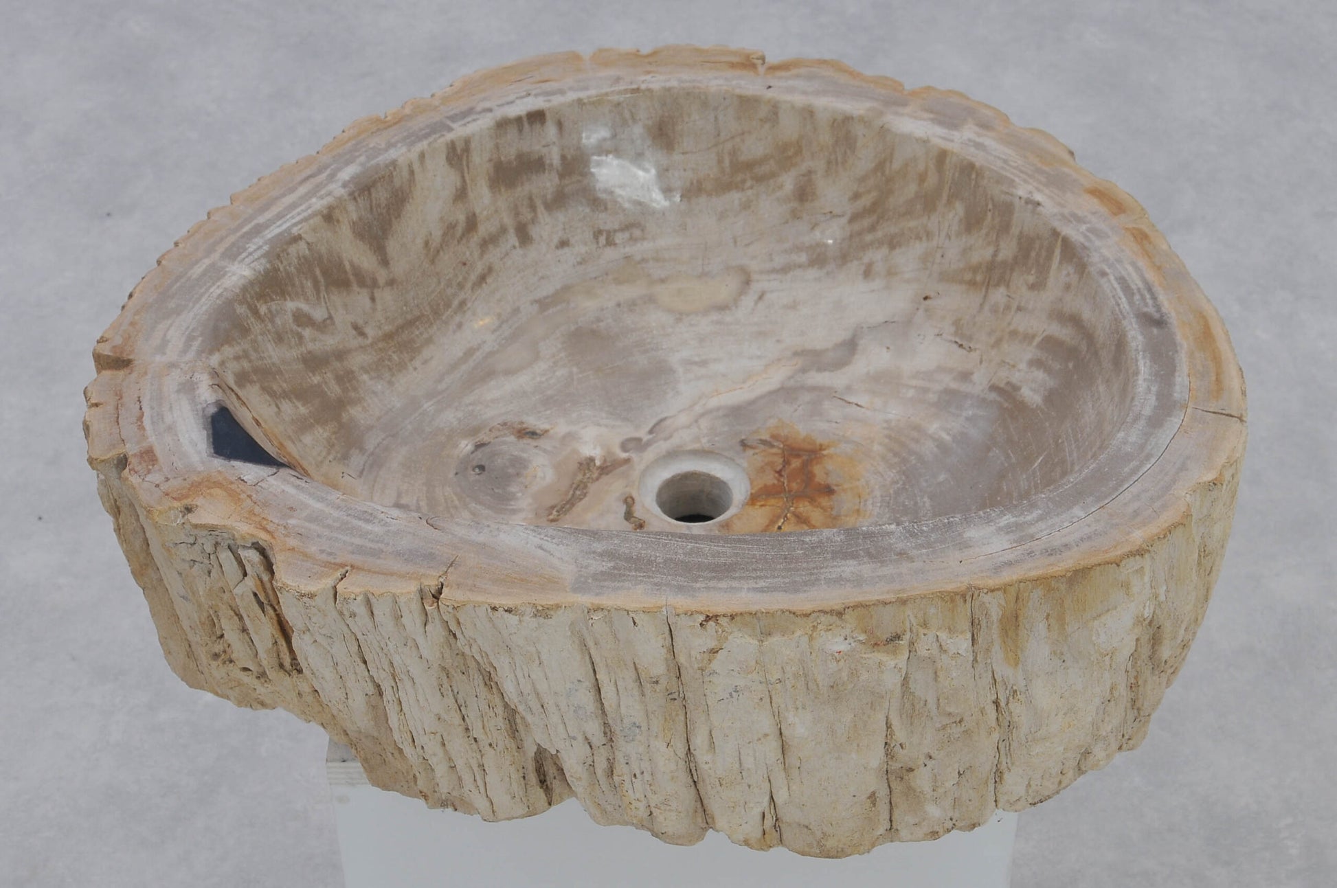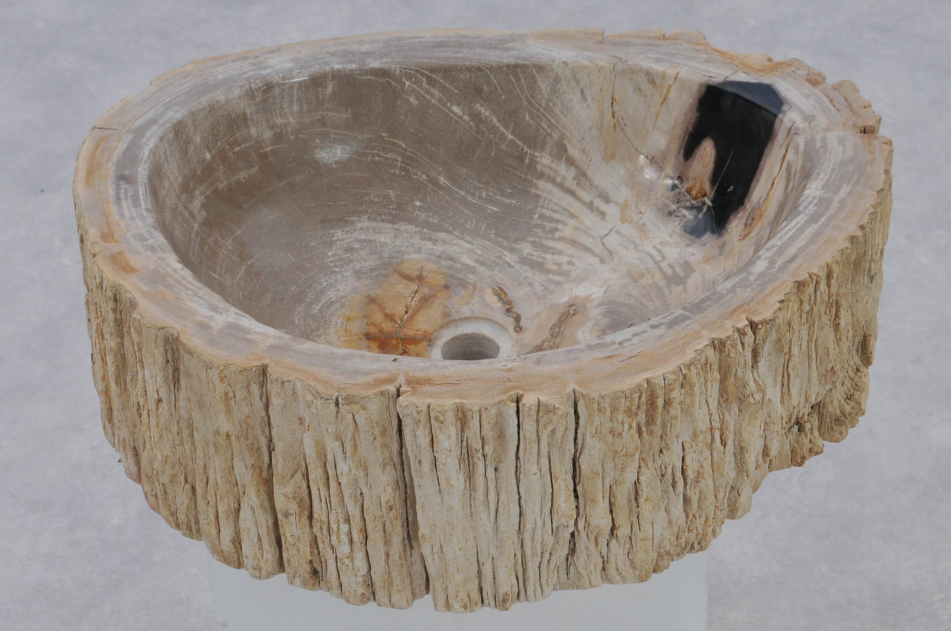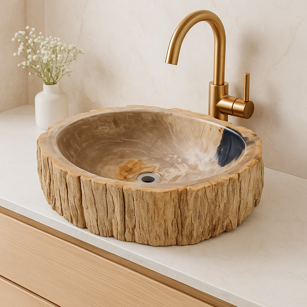 Eksklusiv håndvask skabt af massivt forstenet træ – millioner af år gammelt naturmateriale forvandlet til et unikt designobjekt. Den polerede inderside gør vasken funktionel og elegant, mens den rå yderside bevarer træets organiske struktur. Hver håndvask er et unikat med sit eget naturlige farvespil og leveres med standard afløbshul, så den passer til almindelige installationer.