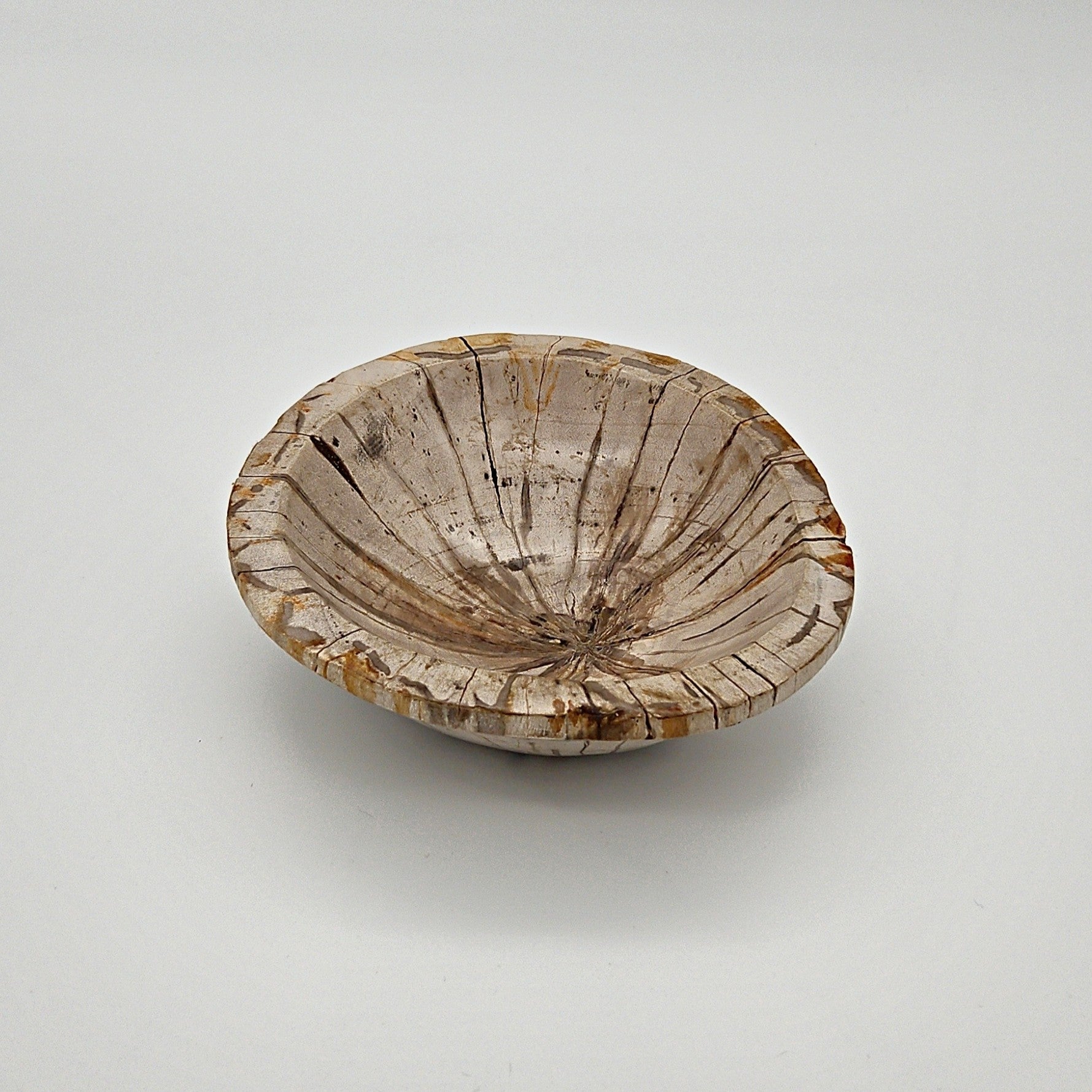 Denne skål i forstenet træ viser tydeligt de oprindelige træfibre og sprækker, som over millioner af år er blevet forvandlet til sten. De linjer og naturlige brud, du ser, er ikke fejl — det er fossile strukturer, der fortæller historien om tid, tryk og mineraler.