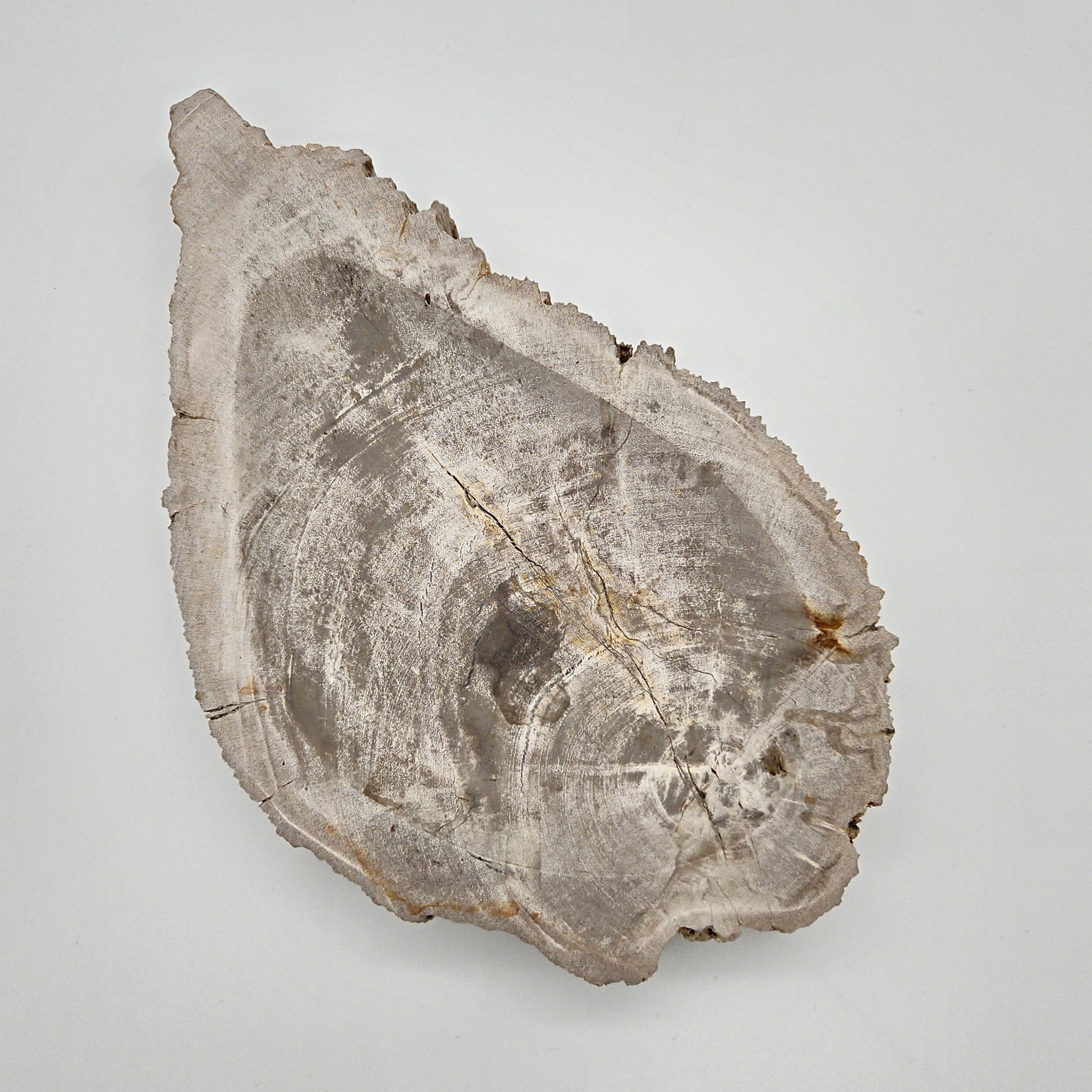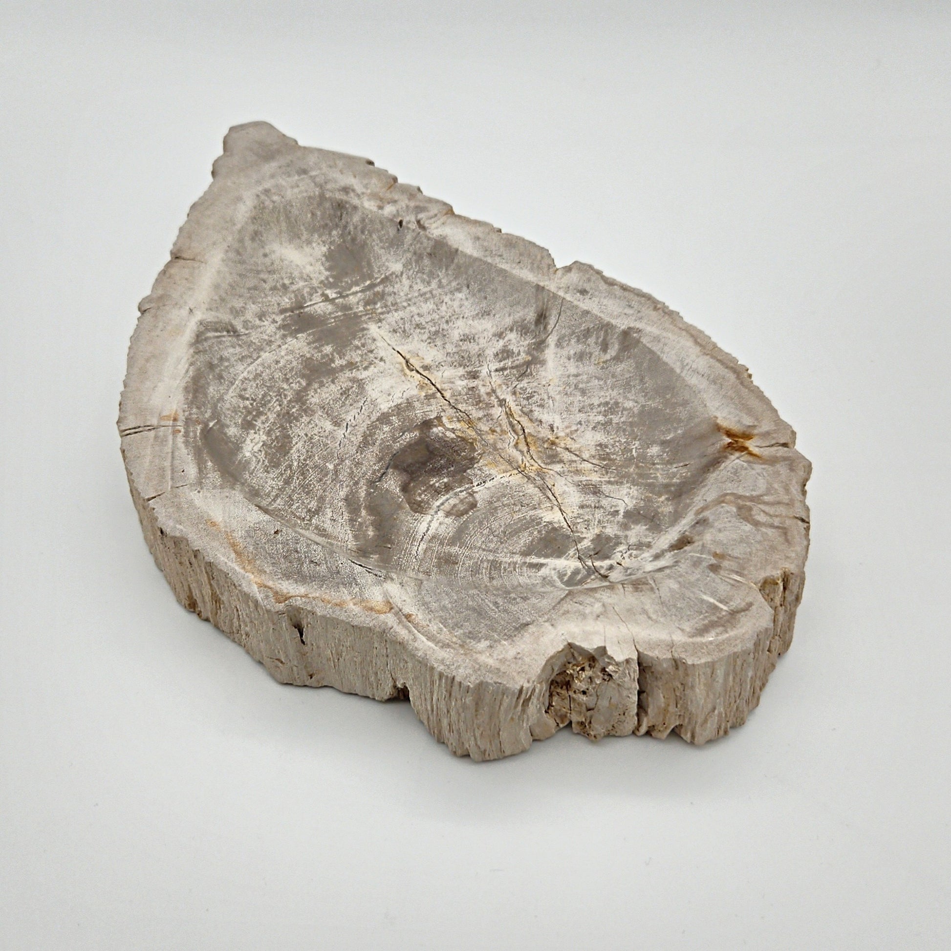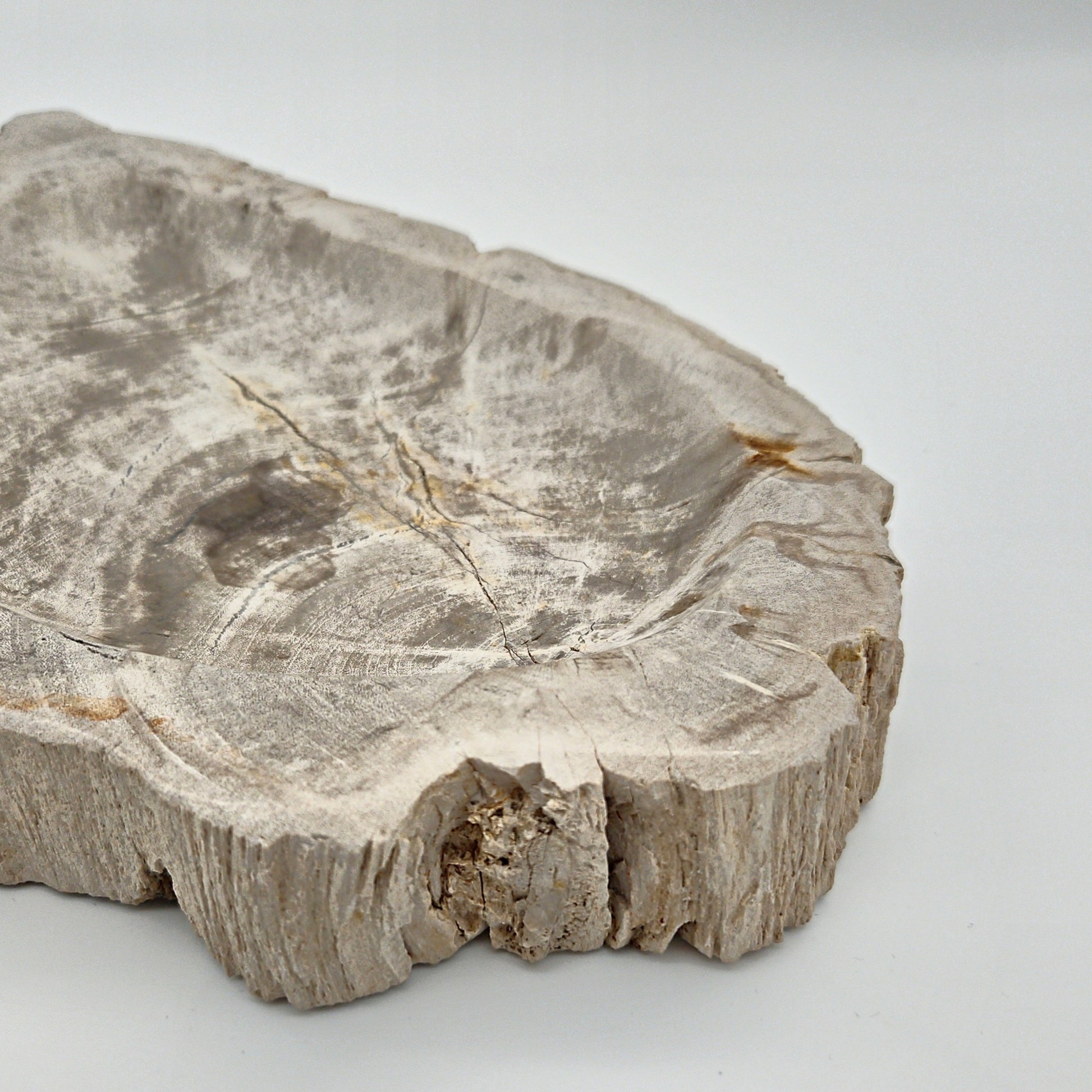 Dette fad er skåret af lyst forstenet træ, der over millioner af år er blevet omdannet til sten. Formen er organisk og asymmetrisk, og kanten står rå og struktureret, som en direkte påmindelse om den oprindelige træstamme. Overfladen indvendigt er håndpoleret, så du får en glat og behagelig finish, mens de fossile ringe og mineralske årer stadig er tydeligt synlige.